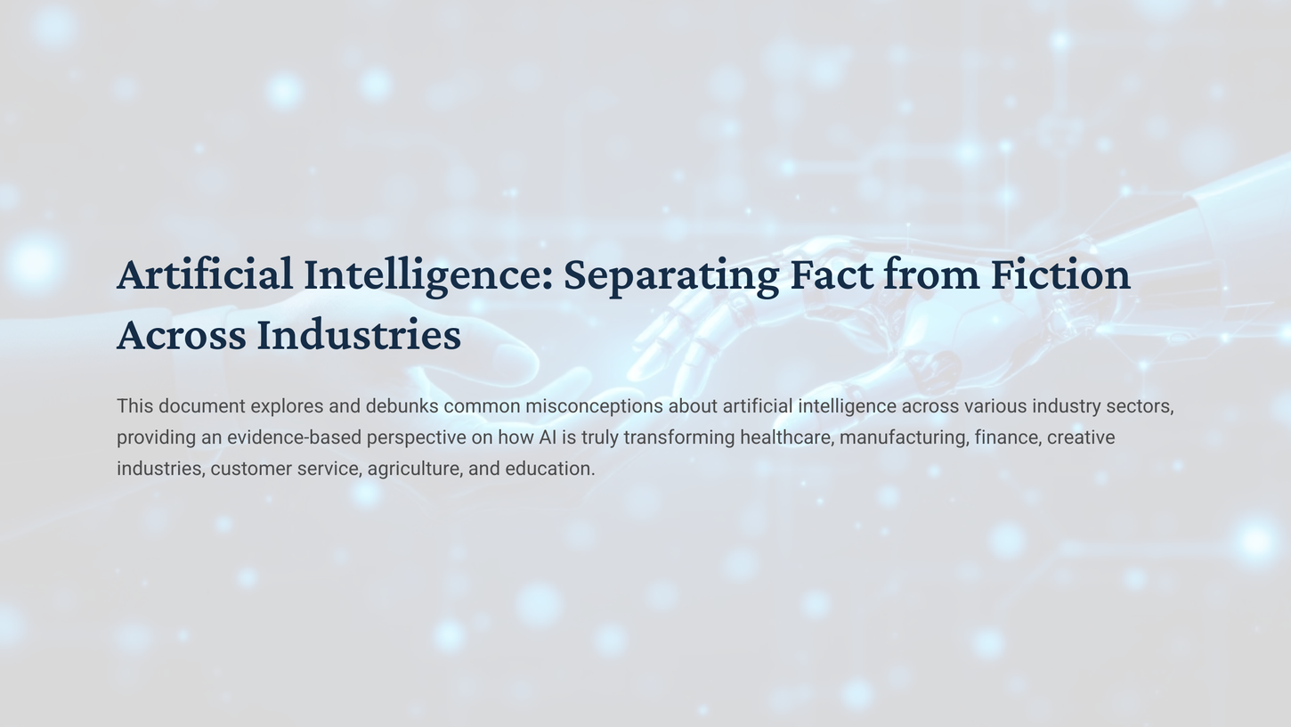 Explore the realities of AI adoption across healthcare, manufacturing, finance, creative industries, customer service, agriculture, and education, debunking common myths and uncovering evidence-based insights.